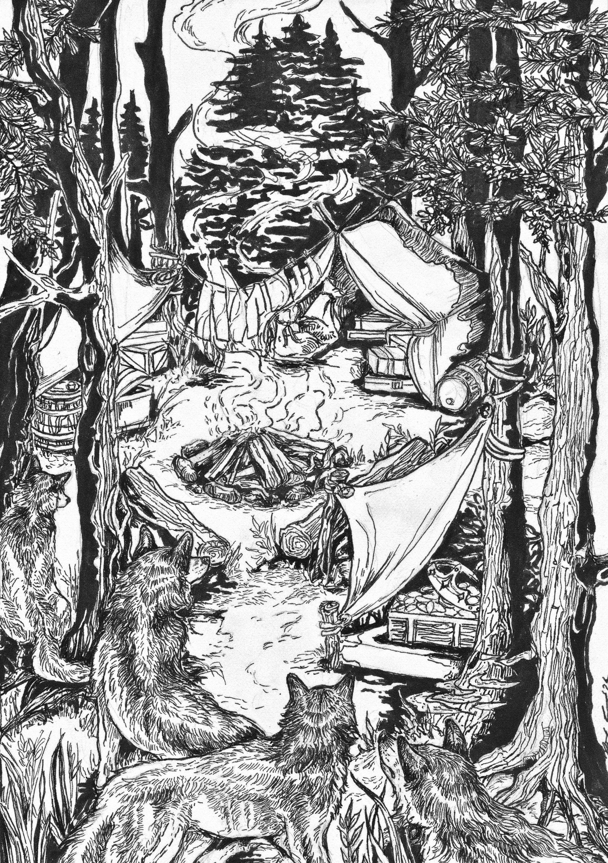 Black and white illustration on textured cardstock paper. From the world of Tales Untold (TU) and RPG/LARP studio 'Unlikely Stories.'
